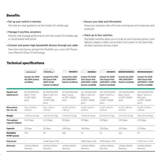 | Device Management | Aruba Instant On Cloud; Web browser; SNMP Manager | |