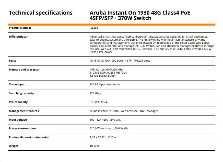 Aruba Instant On 1930 48G Class4 PoE 4SFP/SFP+ 370W Switch (JL686B)