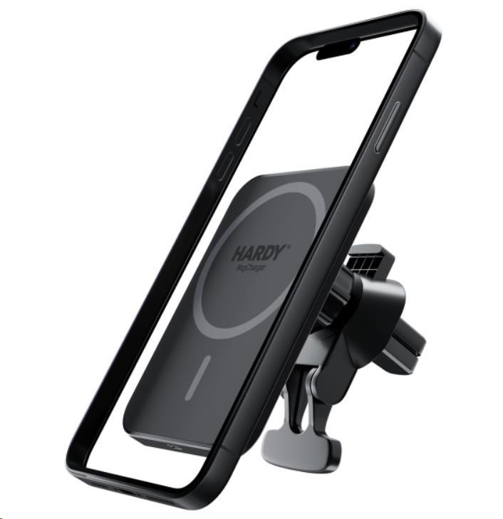 Tato high-tech nabíječka je určena pro chytré telefony iPhone s vestavěnou technologií MagSafe. Modul magnetické nabíječky zapadá do vnitřního magnetického kroužku telefonu a zajišťuje, že iPhone těsně přiléhá k nabíjecí ploše. Magnety drží telefon pevně na místě a chrání jej před pádem nebo změnou polohy za jízdy. Nastavitelný držák zvyšuje stabilitu držáku nabíječky na držáku větracího otvoru ve vozidle. Takže i na hrbolatých cestách je telefon v bezpečí. Stabilní a pohodlný – tak váš iPhone cestuje s nabíječkou HARDY® MagCharger!