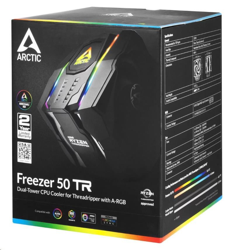 The ARCTIC Freezer 50 TR is a dual-tower CPU cooler with two P-series fans in push-pull-configuration. It is an extremely powerful cooling solution for AMD Ryzen Threadripper CPU, capable of efficiently and quietly cooling CPUs of 32 cores and beyond. The Freezer 50 TR is also ARCTIC’s first CPU cooler equipped with fully addressable RGB, grants you totally customisable illumination and an individual colour look to the PC.