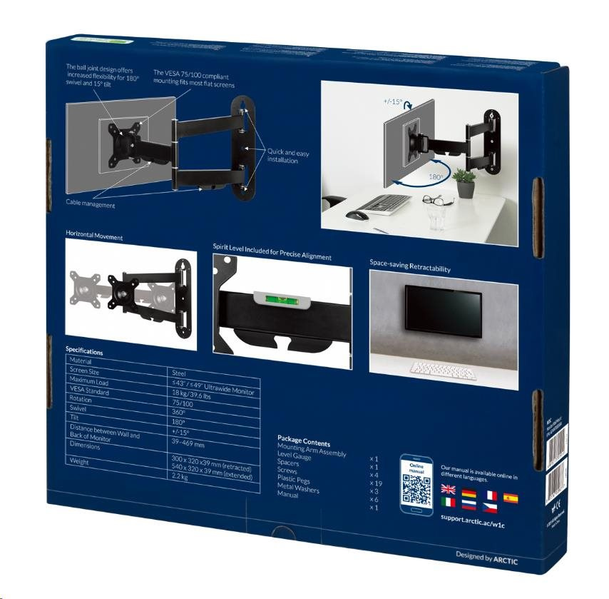 The ARCTIC W1C monitor wall mount supports the latest ultrawide monitors (up to 49 inches) with ease. Classic 16:9 monitors are also compatible (up to 43 inches). The W1C supports a total load 18 kg/39.6 lbs.