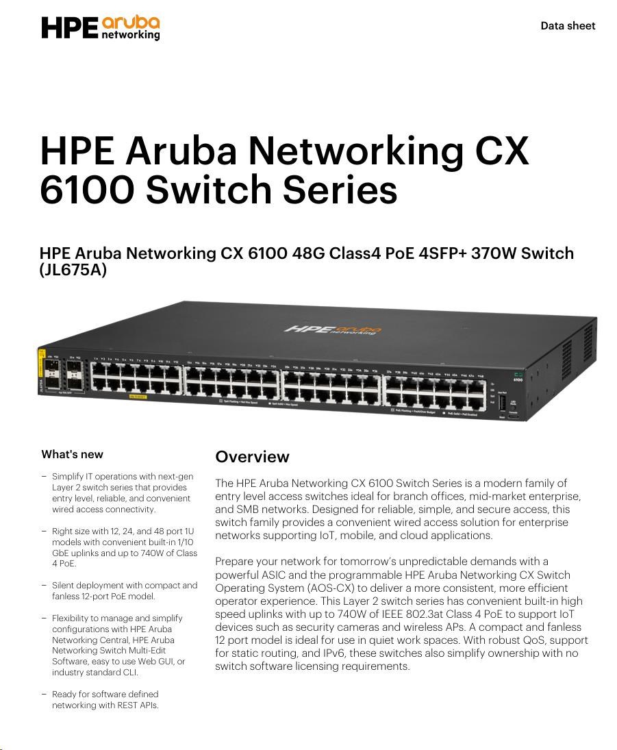 HPE Aruba Networking CX 6100 48G Class4 PoE 4SFP+ 370W Switch RENEW JL675A