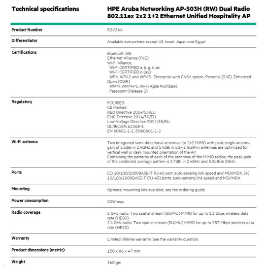 Aruba AP-503H (RW) Dual-radio 802.11ax 2x2 Unified Hospitality AP with 1+2 Ethernet R3V36AR RENEW.