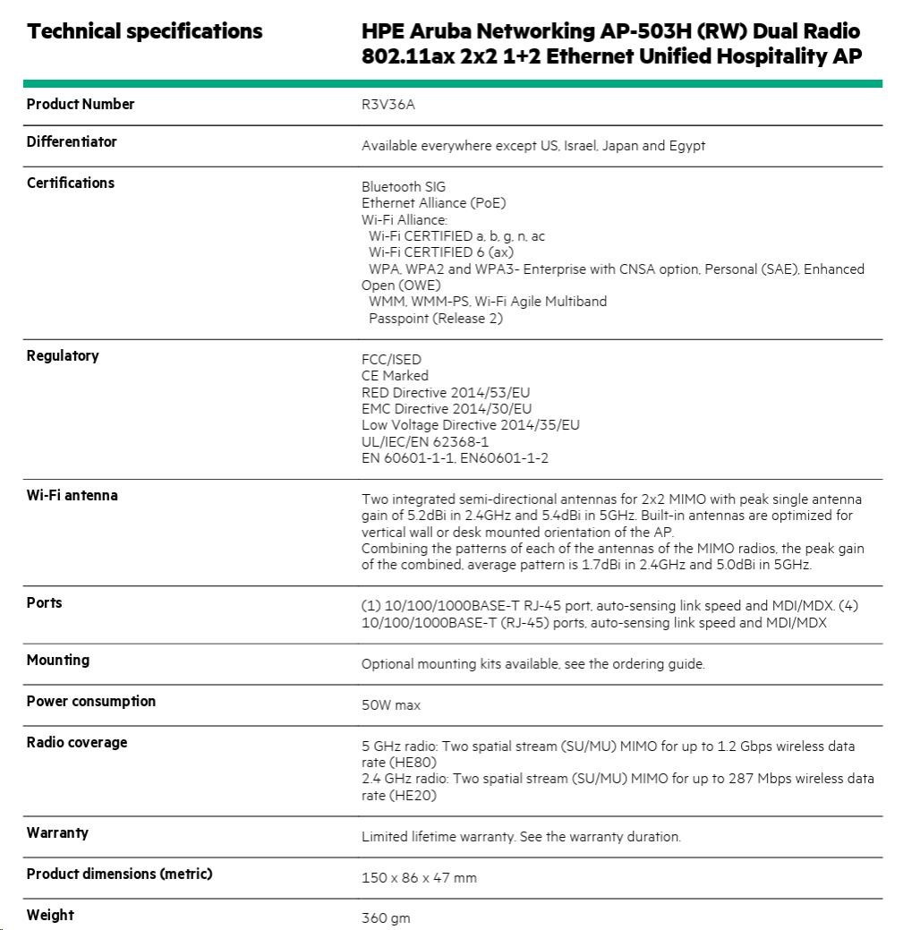 Aruba AP-503H (RW) Dual-radio 802.11ax 2x2 Unified Hospitality AP with 1+2 Ethernet R3V36AR RENEW .