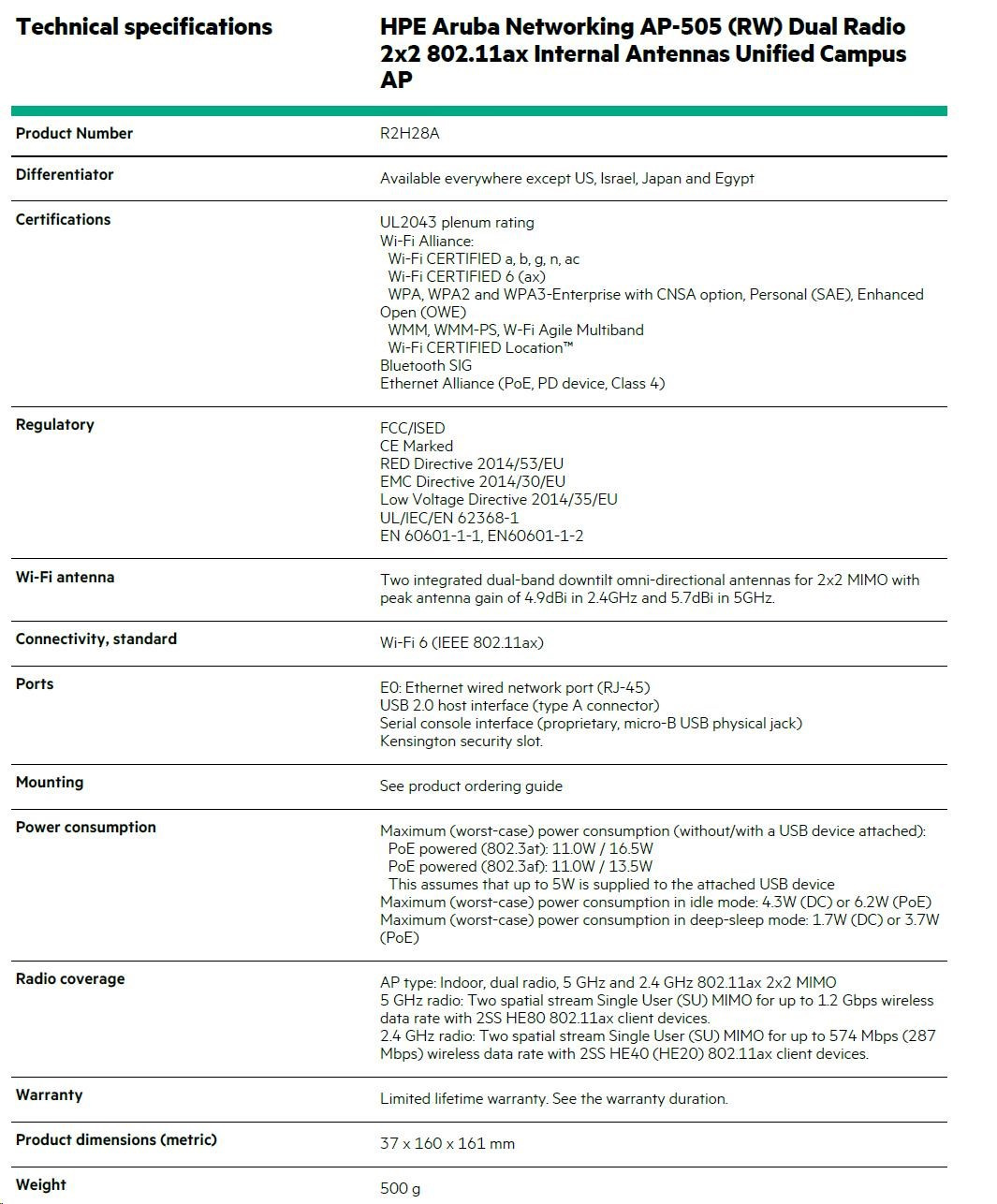 Technical specifications HPE Aruba Networking AP-505 (RW) Dual Radio 2x2 802.11ax Internal Antennas Unified Campus AP Product Number R2H28A Differentiator Available everywhere except US, Israel, Japan and Egypt Certifications UL2043 plenum rating Wi-Fi Alliance: Wi-Fi CERTIFIED a, b, g, n, ac Wi-Fi CERTIFIED 6 (ax) WPA, WPA2 and WPA3-Enterprise with CNSA option, Personal (SAE), Enhanced Open (OWE) WMM, WMM-PS, W-Fi Agile Multiband Wi-Fi CERTIFIED Location™ Bluetooth SIG Ethernet Alliance (PoE, PD device, Class 4) Regulatory FCC/ISED CE Marked RED Directive 2014/53/EU EMC Directive 2014/30/EU Low Voltage Directive 2014/35/EU UL/IEC/EN 62368-1 EN 60601-1-1, EN60601-1-2 Wi-Fi antenna Two integrated dual-band downtilt omni-directional antennas for 2x2 MIMO with peak antenna gain of 4.9dBi in 2.4GHz and 5.7dBi in 5GHz. Connectivity, standard Wi-Fi 6 (IEEE 802.11ax) Ports E0: Ethernet wired network port (RJ-45) USB 2.0 host interface (type A connector) Serial console interface (proprietary, micro-B USB physical jack) Kensington security slot. Mounting See product ordering guide Power consumption Maximum (worst-case) power consumption (without/with a USB device attached): PoE powered (802.3at): 11.0W / 16.5W PoE powered (802.3af): 11.0W / 13.5W This assumes that up to 5W is supplied to the attached USB device Maximum (worst-case) power consumption in idle mode: 4.3W (DC) or 6.2W (PoE) Maximum (worst-case) power consumption in deep-sleep mode: 1.7W (DC) or 3.7W (PoE) Radio coverage AP type: Indoor, dual radio, 5 GHz and 2.4 GHz 802.11ax 2x2 MIMO 5 GHz radio: Two spatial stream Single User (SU) MIMO for up to 1.2 Gbps wireless data rate with 2SS HE80 802.11ax client devices. 2.4 GHz radio: Two spatial stream Single User (SU) MIMO for up to 574 Mbps (287 Mbps) wireless data rate with 2SS HE40 (HE20) 802.11ax client devices. Warranty Limited lifetime warranty. See the warranty duration. Product dimensions (metric) 37 x 160 x 161 mm Weight 500 g