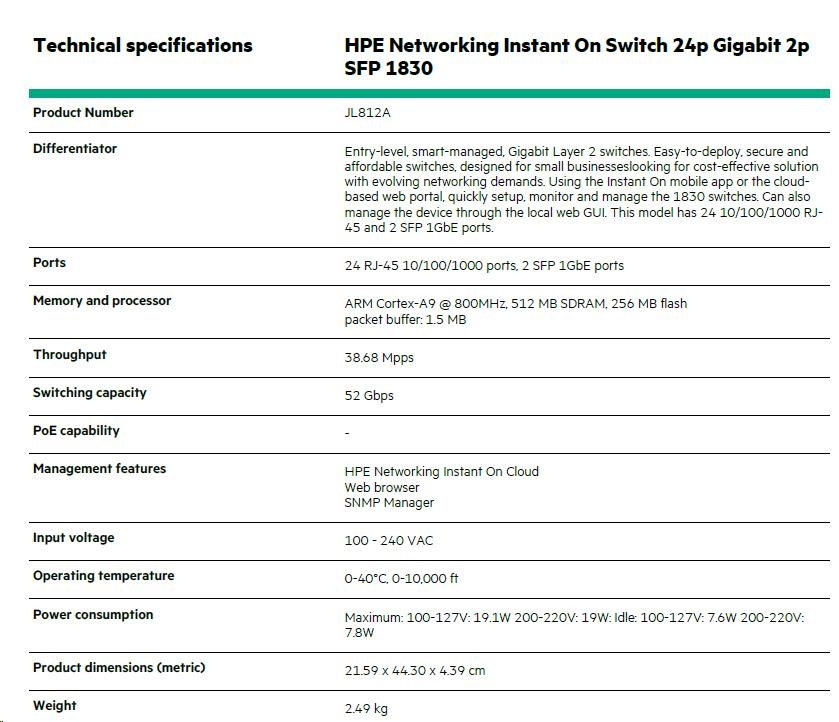 HPE Networking Instant On Switch 24p Gigabit 2p SFP 1830 ( JL812A )