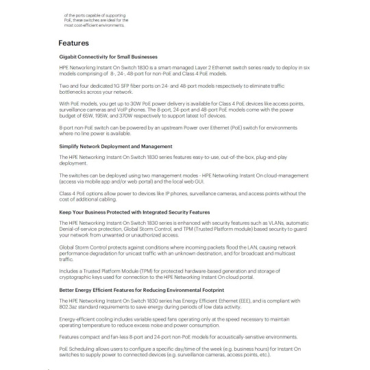 | Aruba Instant On 1830 8G Switch (JL810A) | Aruba Instant On 1830 8G 4p Class4 PoE 65W Switch (JL811A) | Aruba Instant On 1830 24G 2SFP Switch (JL812A) | Aruba Instant On 1830 24G 12p Class4 PoE 2SFP 195W Switch (JL813A) | Aruba Instant On 1830 48G 4SFP Switch (JL814A) | Aruba Instant On 1830 48G 24p Class4 PoE 4SFP 370W Switch (JL815A) | ||||||||