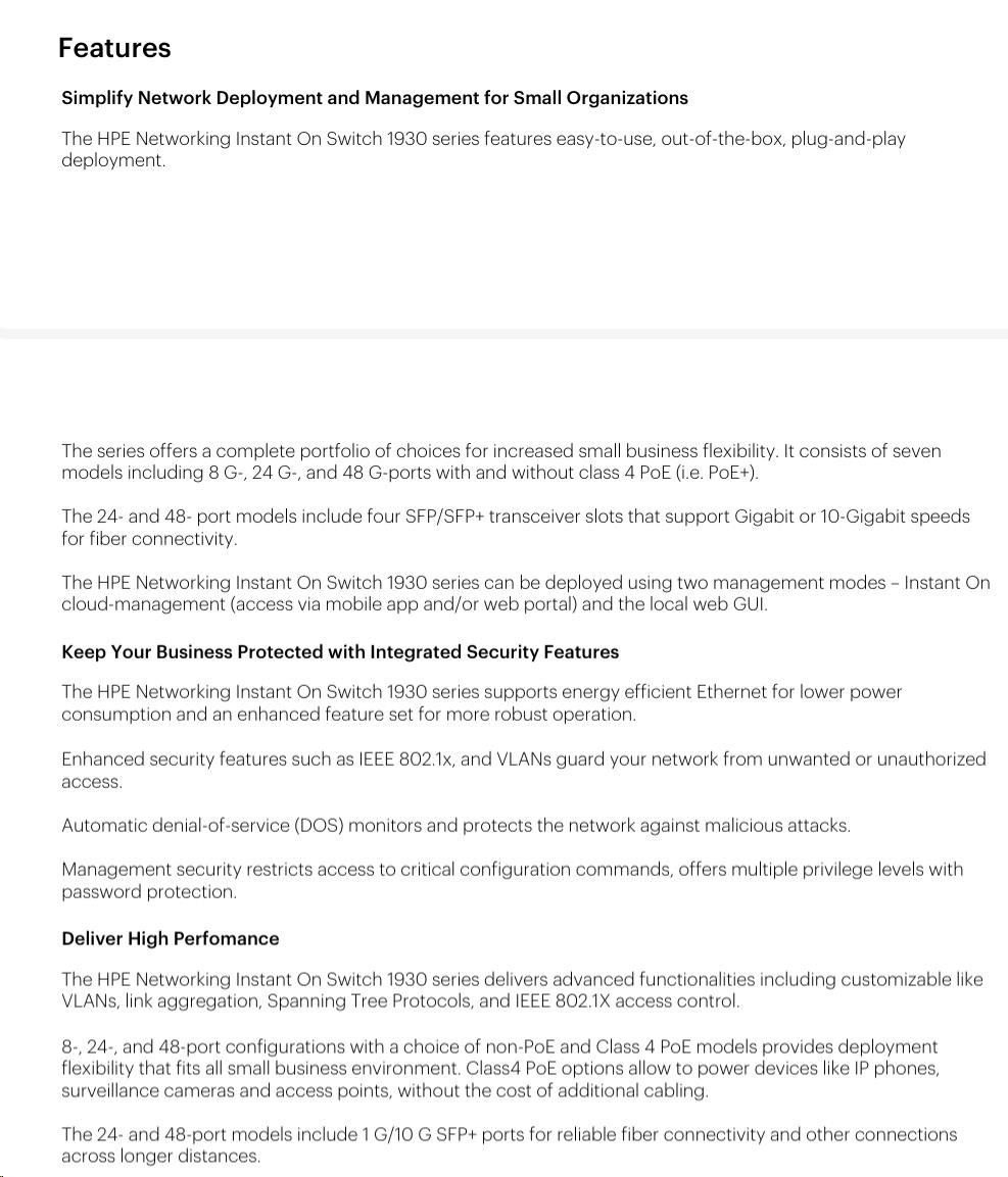 The Aruba Instant On 1930 switches features advanced, smart-managed, fixed- configuration Gigabit switches designed for small businesses that are easy-to-deploy and affordable. They're made to handle today's bandwidth-heavy applications like voice and video conferencing, enabling consistent connectivity to enhance performance.