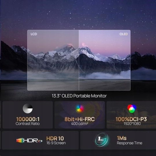 Arzopa A3C Pro je přenosný monitor, který kombinuje skvělou kvalitu obrazu s maximální funkčností. Díky panelu OLED poskytuje živé barvy, vynikající kontrast a rychlou dobu odezvy, takže je ideální pro hráče, tvůrce obsahu a ty, kteří potřebují další obrazovku pro mobilní práci. Jeho kompaktní design, nízká hmotnost a všestrannost vám umožní vzít si jej kamkoli - do kanceláře, kavárny nebo na výlet. Možnost změny orientace obrazovky z polohy na šířku na polohu na výšku usnadňuje přizpůsobení monitoru vašim aktuálním potřebám a zvyšuje pohodlí a produktivitu.