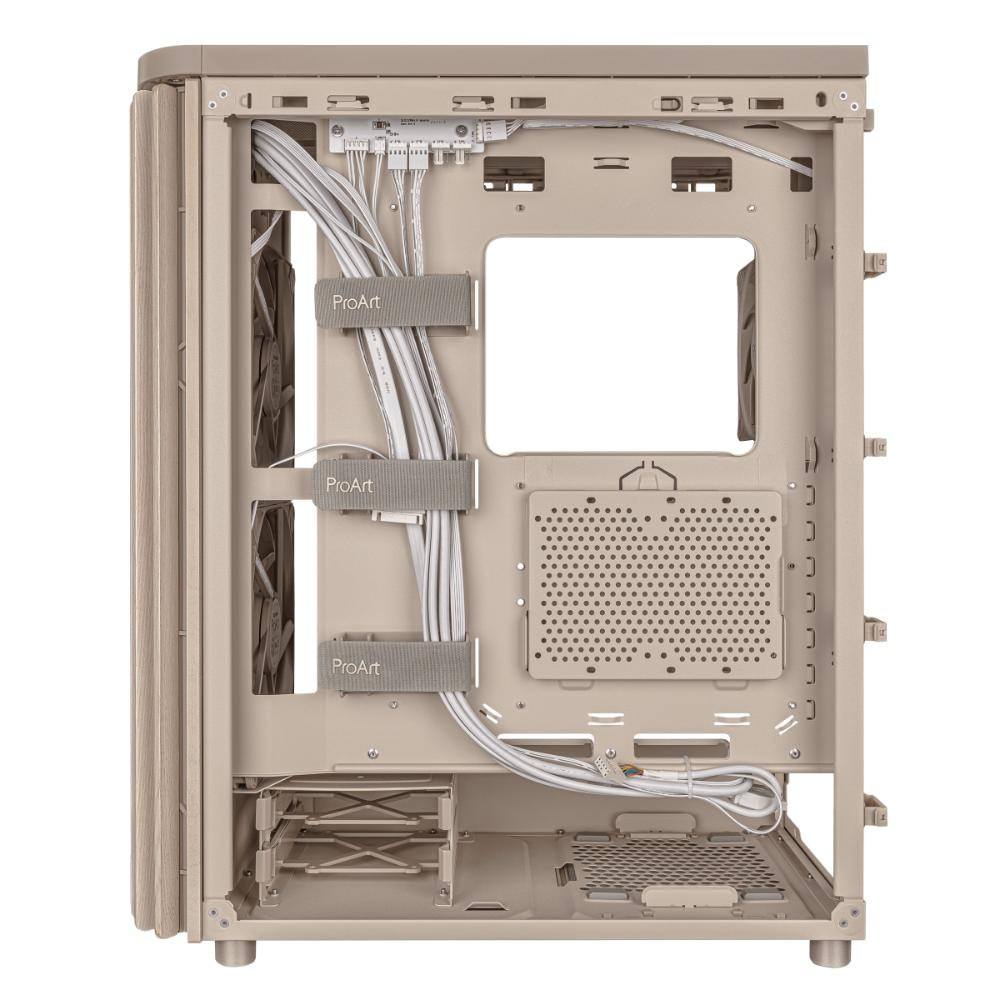 ProArt PA401 Wood Edition Beige má dřevěný přední panel, který vytváří výrazný a elegantní vzhled a zároveň podporuje udržitelnost. Použité dřevo je certifikováno Forest Stewardship Council (FSC) a je dokončeno šestimístným procesem úpravy. Skříň také nabízí optimální vestavěné chlazení se dvěma 160mm předními ventilátory a jedním 120mm zadním ventilátorem, spolu s integrovaným hubem pro ventilátory, který umožňuje optimální proudění vzduchu.