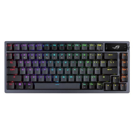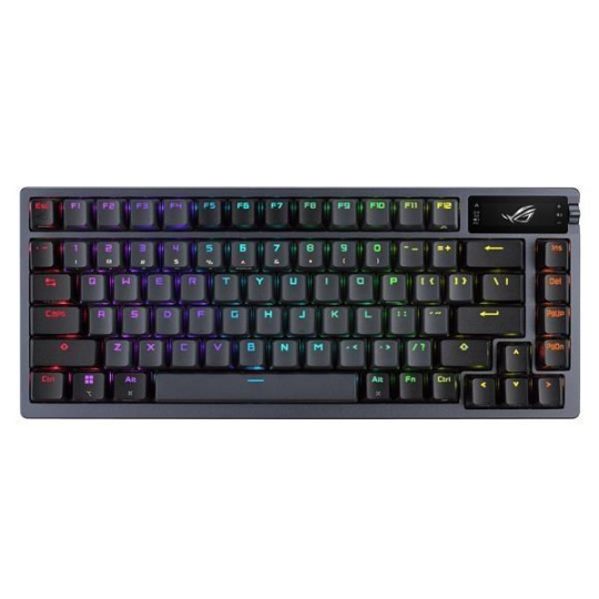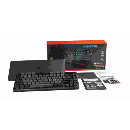 Zakázková herní klávesnice ROG Azoth s tvarovým faktorem klávesnice 75, těsněním, třívrstvou tlumicí pěnou a kovovým horním krytem, vysoce přizpůsobitelná s předem namazanými mechanickými spínači ROG NX vyměnitelnými za provozu, stabilizátory klávesnice ROG, kryty kláves PBT doubleshot a mazací sadou, tri - připojení režimu s 2,4 GHz technologií SpeedNova, OLED displejem, třícestným ovládacím knoflíkem, třemi úhly náklonu a podporou Mac