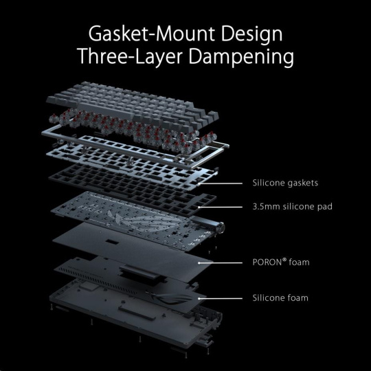 - Jedinečný design uchycení těsnění: Silikonový držák těsnění se třemi vrstvami tlumící pěny v kombinaci poskytují bezkonkurenční zážitek z psaní