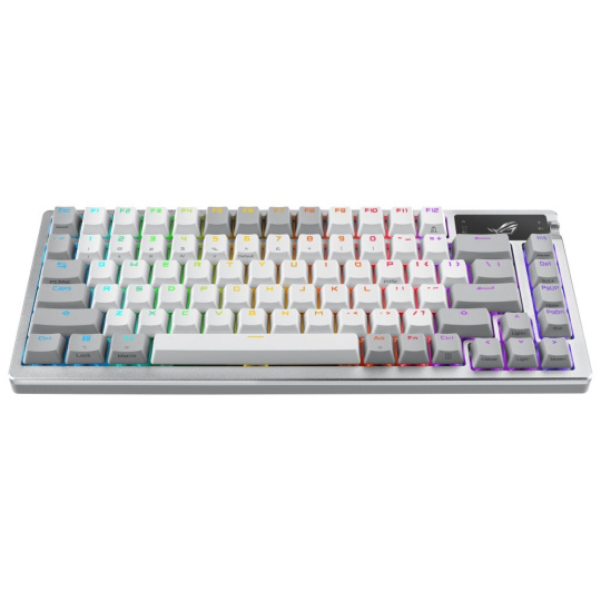 Zakázková herní klávesnice ROG Azoth s tvarovým faktorem klávesnice 75, těsněním, třívrstvou tlumicí pěnou a kovovým horním krytem, vysoce přizpůsobitelná s předem namazanými mechanickými spínači ROG NX vyměnitelnými za provozu, stabilizátory klávesnice ROG, kryty kláves PBT doubleshot a mazací sadou, tri - připojení režimu s 2,4 GHz technologií SpeedNova, OLED displejem, třícestným ovládacím knoflíkem, třemi úhly náklonu a podporou Mac