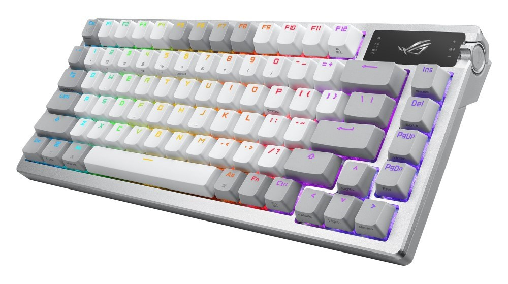 Zakázková herní klávesnice ROG Azoth s tvarovým faktorem klávesnice 75, těsněním, třívrstvou tlumicí pěnou a kovovým horním krytem, vysoce přizpůsobitelná s předem namazanými mechanickými spínači ROG NX vyměnitelnými za provozu, stabilizátory klávesnice ROG, kryty kláves PBT doubleshot a mazací sadou, tri - připojení režimu s 2,4 GHz technologií SpeedNova, OLED displejem, třícestným ovládacím knoflíkem, třemi úhly náklonu a podporou Mac