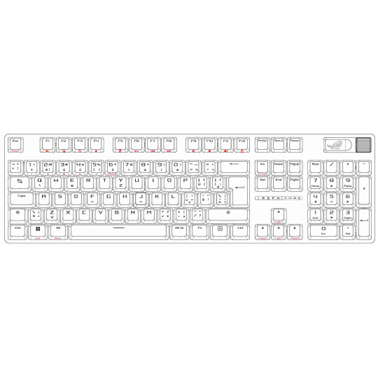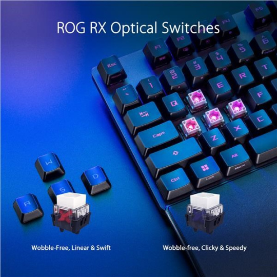 - PBT / ABS klávesy s UV vrstvou: Odolné klávesy ROG PBT doubleshot nebo klávesy ABS s UV vrstvou nabízejí prvotřídní pocit a odolnost proti lesku