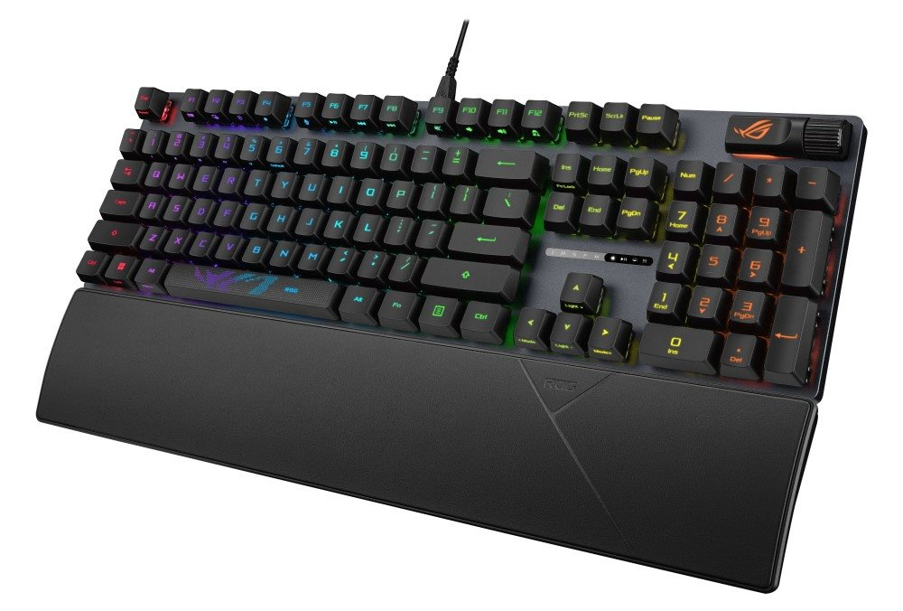 Herní klávesnice ROG Strix Scope II s předem namazanými mechanickými spínači ROG NX Snow a NX Storm, pěnou tlumící zvuk, dvojitými krytkami kláves PBT nebo ABS s UV povlakem, klávesovými zkratkami pro streamování, multifunkčními ovládacími prvky, třemi úhly sklonu a opěrkou zápěstí