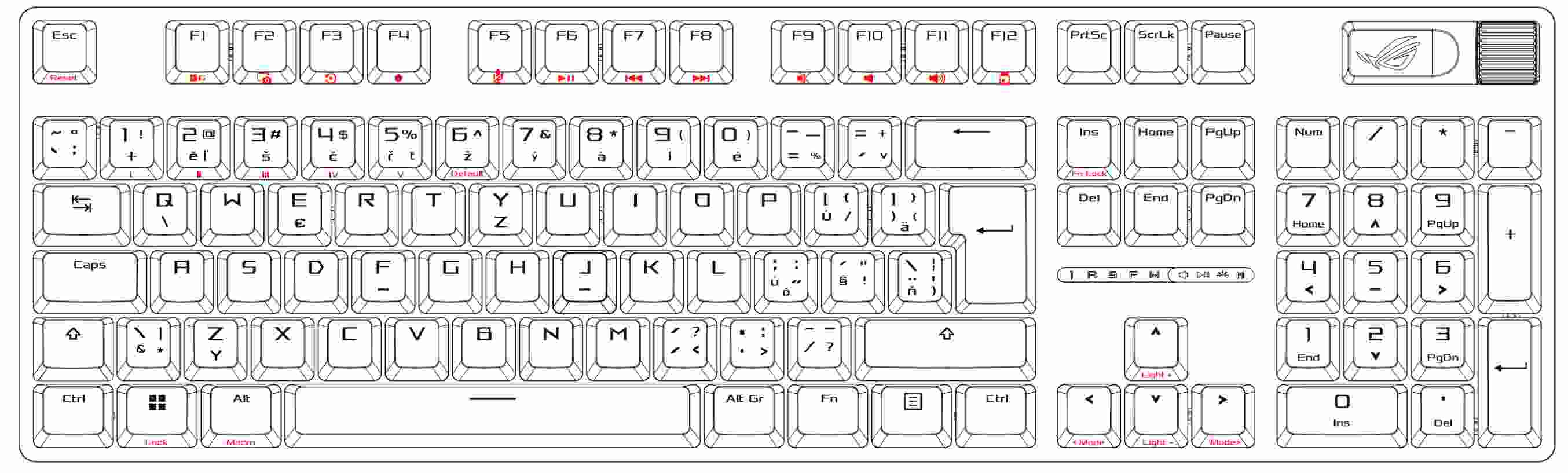 - PBT / ABS klávesy s UV vrstvou: Odolné klávesy ROG PBT doubleshot nebo klávesy ABS s UV vrstvou nabízejí prvotřídní pocit a odolnost proti lesku