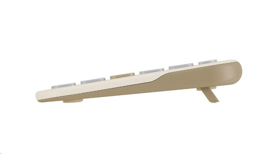 Rozložení kláves odpovídá notebooku, s dvěma systémovými přepínači pro plynulé přepínání mezi režimy Windows, ChromeOS, MacOS, iOS a iPadOS. Odolné spínače s životností 10 milionů kliknutí a povrchovou úpravou odolnou proti UV záření. Nový papírový obal je šetrný k životnímu prostředí, eliminující plastové materiály z předchozích obalů klávesnic.