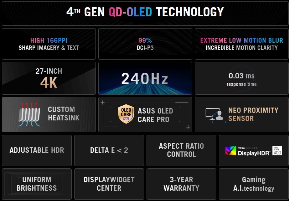 Herní monitor ROG Strix OLED XG27UQDMS – 27 palců (26,5 palců viditelná plocha) 4K (3840 x 2160) Tandemový panel QD-OLED, 240 Hz, 0,03 ms (GTG), kompatibilní s G-SYNC®, vlastní chladič, senzor Neo Proximity, rovnoměrný jas, 99 % DCI-P3, OLED Care Pro, ASUS DisplayWidget Center