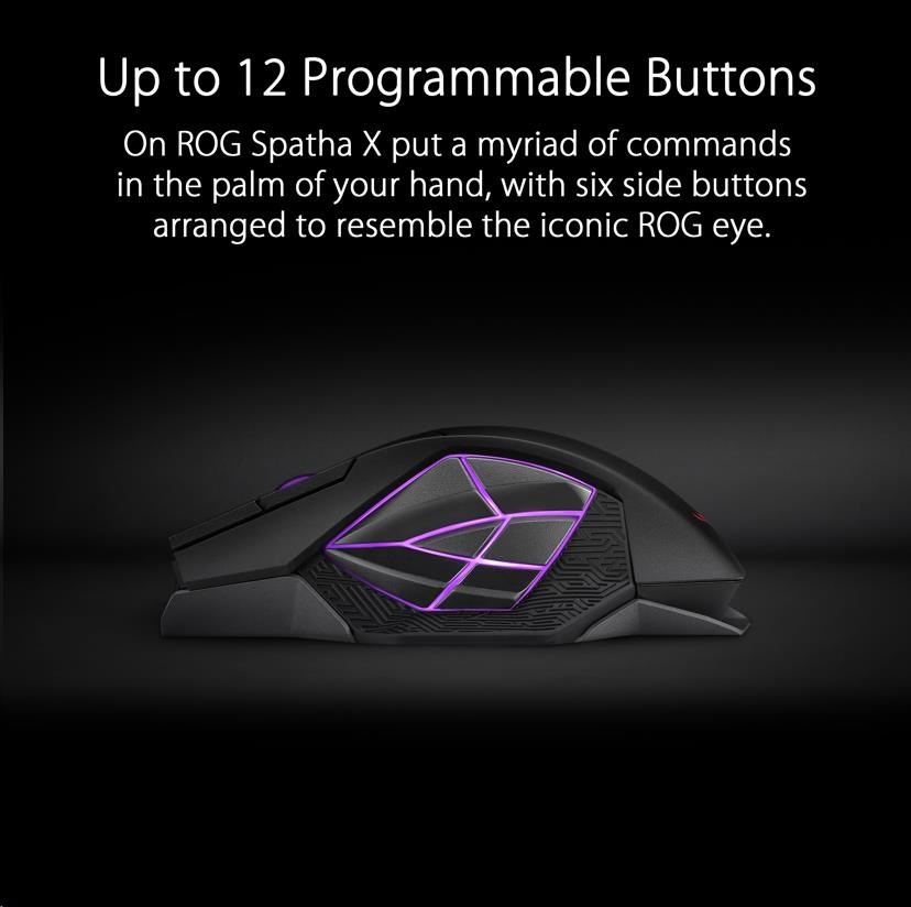 • Up to 12 Programmable Buttons - The 12 programmable buttons on ROG Spatha X put a myriad of commands in the palm of your hand, with six side buttons arranged to resemble the iconic ROG eye. The placement of each button has been carefully considered so they’re within reach, and all have been designed to provide a tactile click feel for intuitive, responsive control.