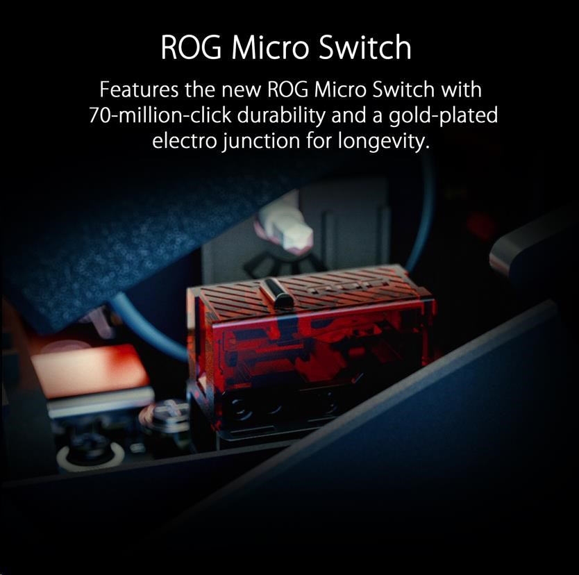• ROG Micro Switch - The ROG Micro Switch features a gold-plated electro-junction and a 70-million-click lifespan to improve durability and extend the lifespan of the mouse. Strict ROG manufacturing standards ensure that each mouse button keeps force deviation within +/- 5 gram-force for a consistent click feel.