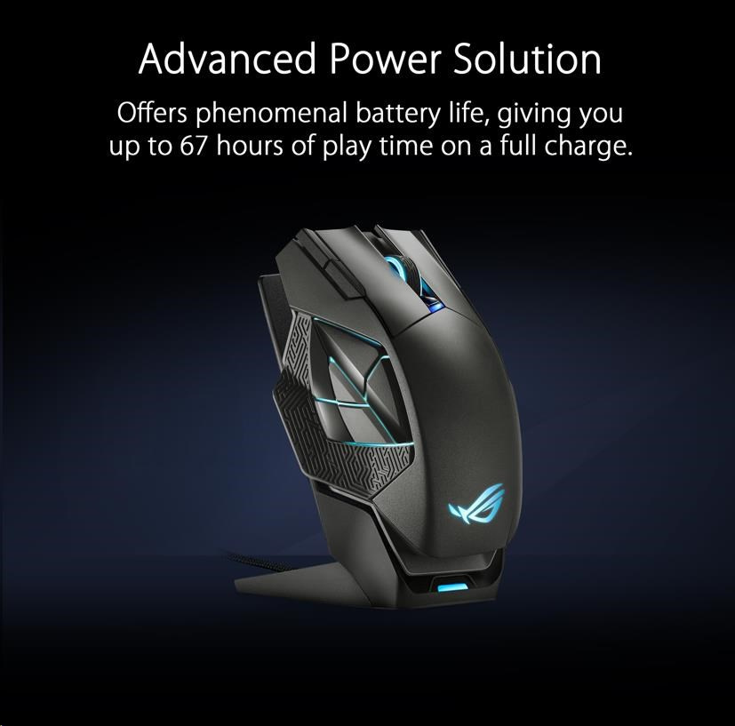 • Advanced Power Solution - ROG Spatha X offers phenomenal battery life, giving you up to 67 hours of play time on a full charge. And if the battery does run low, just 15 minutes of charging via USB-C or the charging dock provides up to 12 hours* of intense wireless gaming.