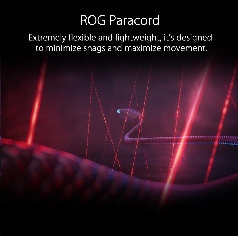 • ROG Paracord - The extremely flexible and lightweight ROG Paracord is designed to minimize snags and maximize movement. The raised port of ROG Spatha X provides space between the cable and tabletop or mousepad surface, minimizing cable drag and noise.
