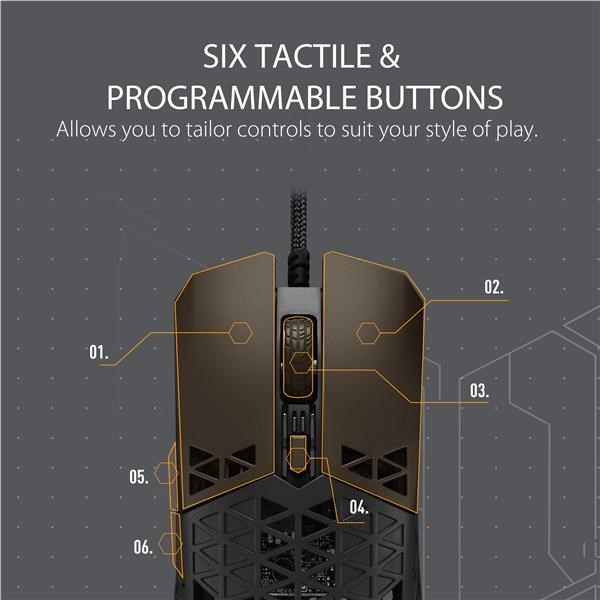 A lightweight wired gaming mouse with 16,000 dpi sensor, six programmable buttons, ultralight Air Shell, IPX6 water resistance , ASUS Antibacterial Guard, TUF Gaming Paracord and pure PTFE feet