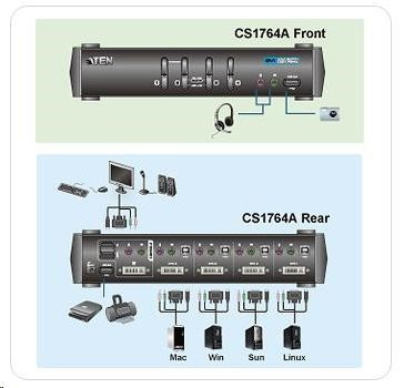 CS1764A ATEN 4-port DVI KVMP USB, 2port USB HUB, audio, 1.2m kabely 4PC - 1 DVI + 1 USB kláves. + 1 USB myš + 2 USB periferie Umožňuje ovládat pomocí USB konzole (klávesnice + myš + DVI monitor) až 4 počítače a dvě další USB 2.0 periferie. - extrémní kvalita videa až 1920 x 1200, 60Hz; DDC2B - umožňuje spravovat 4 PC na jedné kl.,m.,monitoru a dvě dalši USB 2.0 zařízení - možnost připojit počítače po USB - možnost nezávislého přepínání PC a USB a audio zařízení - včetně kabelů pro propojení PC-přepínač - multiplatformní podpora - Windows, Linux, Mac a Sun - výběr PC pomocí hotkey kláves nebo tlačítka na předním panelu - včetně kabelů, v sadě - umožňuje i přepínání audia (až 2.1 audio) - DVI digital a analog podpora monitoru - HDCP compliant - Video DynaSync™ - uchová informaci o monitoru konzole EDID (Extended Display Identification Data) - Power on detection - jestliže je počítač vypnut, přepne na další aktivní port - Sun /Mac podpora klávesnice a její emulace - Auto Scan Mode V balení: 1x CS1764A USB 2.0 DVI KVMP™ Switch 4x Kabelový set pro připojení 4 PC (DVI-D) 1x Napájecí adaptér 1x Manuál 1x Quick Start příručka Podpora Windows 7..