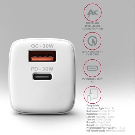 AXAGON ACU-PQ30W, Sil nabíječka do sítě 30W, 2x port (USB-A + USB-C), PD3.0/PPS/QC4+/SFC/AFC/Apple, bílá
