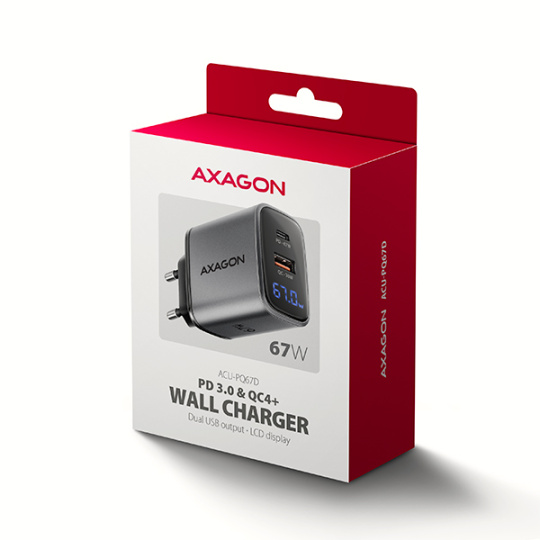 AXAGON ACU-PQ67D GaN nabíječka do sítě 67W, USB-A + USB-C, PD3.0/PPS/QC4+/SFC2.0/Apple, LCD display