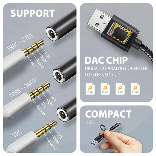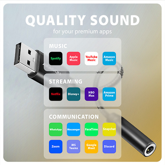 Tato externí zvuková karta je vhodná pro přehrávání bezztrátových audio formátů jako DSD, FLAC, WMA, WAV, APE, AAC nebo ALAC. Maximální kvalitu zvuku využijete také při poslechu hudby na streamovacích platformách jako Spotify, Apple Music, YouTube Music nebo Amazon Music Unlimited. Adaptér lze využít i při sledování streamovacích služeb jako Netflix, Disney+, HBO Max, Amazon Prime nebo Apple TV+.