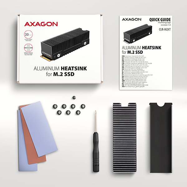 AXAGON CLR-M2XT ALU je pasivní hliníkový chladič určený pro intenzivní chlazení výkonných NVMe M.2 SSD disků. Univerzální heatsink lze použít pro M.2 karty o rozměru 22 x 80 mm. Dodávané teplovodivé podložky, umožní montáž chladiče pro všechny jednostranné i oboustranné M.2 SSD disky.