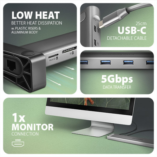 Multiportový USB-C 5Gbps AXAGON HMC-10HLS LONGER hub 9in1 rozšíří Váš notebook, počítač nebo telefon o devět portů. Přes oboustranný USB-C konektor snadno a rychle připojíte k počítači monitor, čtyři USB zařízení, Gigabitovou ethernet síť a čtečku SD karet. Zároveň získáte možnost napájení notebooku pomocí technologie Power Delivery. Replikátor portů vám tak poskytne jednoduchou a skladnou dokovací stanici 9v1 nejen k Windows notebookům ale i Apple notebookům jako je například MacBook Air nebo MacBook Pro.