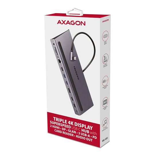 AXAGON HMC-4KX3 USB 5Gbps hub, 3x USB-A, 2x HDMI, DP, RJ-45 GLAN, SD/microSD, audio, PD 100W, kabel USB-C 40cm