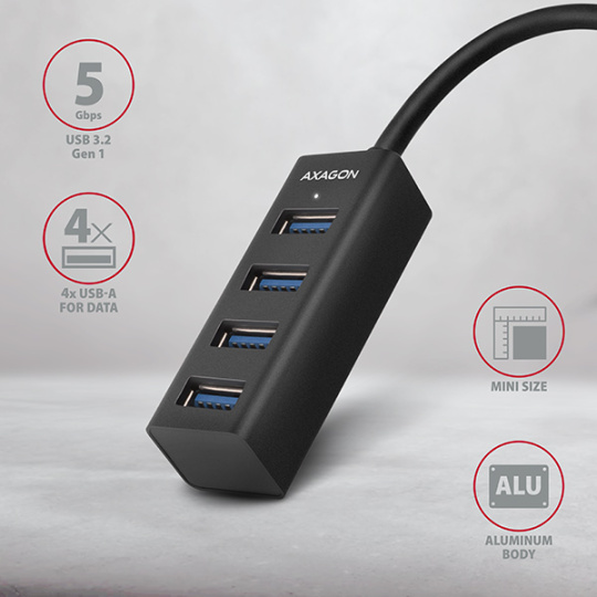 AXAGON HUE-M1AL, 4x USB 3.2 Gen 1 MINI hub, kovový, kabel USB-A 1.2m