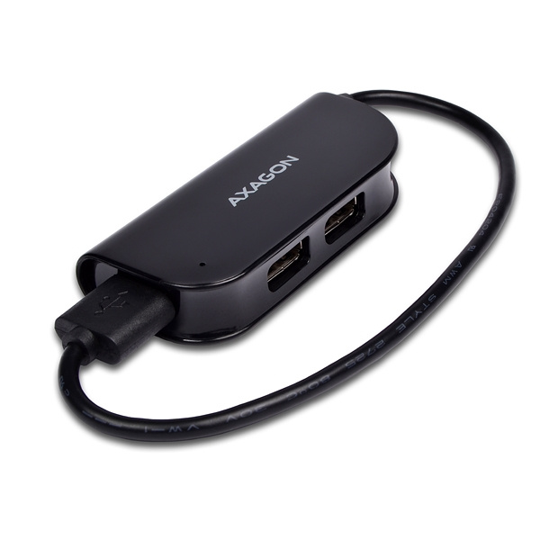 Čtyřportový USB 2.0 READY hub AXAGO HUE-X4B s napevno uchyceným USB kabelem.