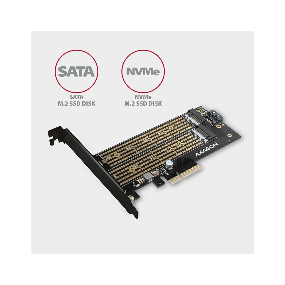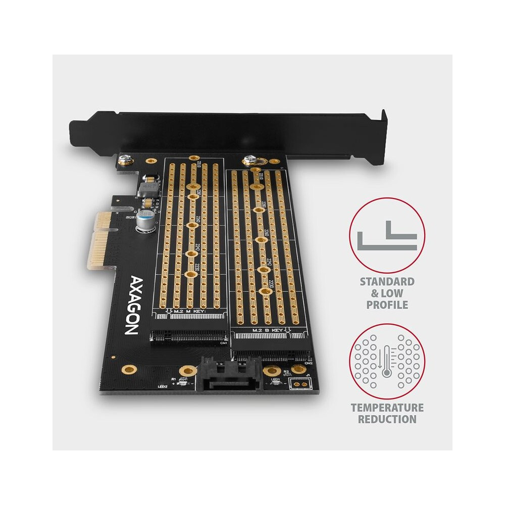 AXAGON PCEM2D PCIe x4 M.2 NVMe Mkey + SATA Bkey slot adaptér vč. LP