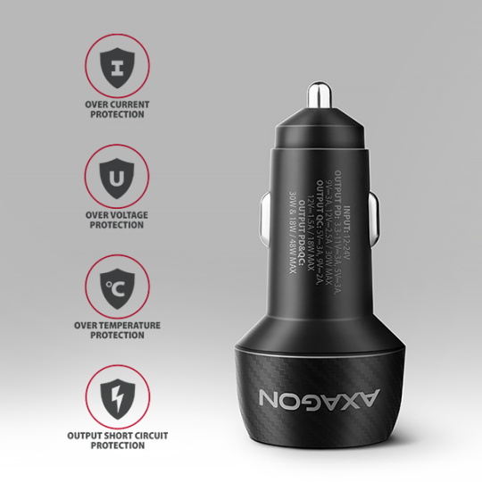AXAGON PWC-PQ48 nabíječka do auta 48W, USB-A + USB-C, PD3.0/PPS/QC4+/SFC/Apple