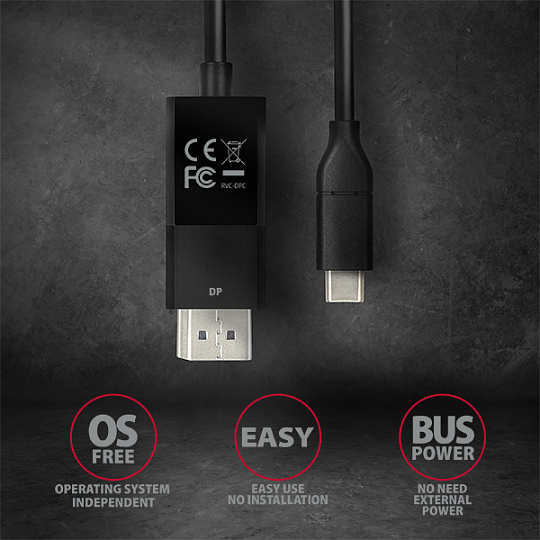 Aktivní USB-C -> DisplayPort kabel - redukce AXAGON RVC-DPC pro připojení DisplayPort monitoru/TV/projektoru k notebooku nebo telefonu pomocí USB-C konektoru.