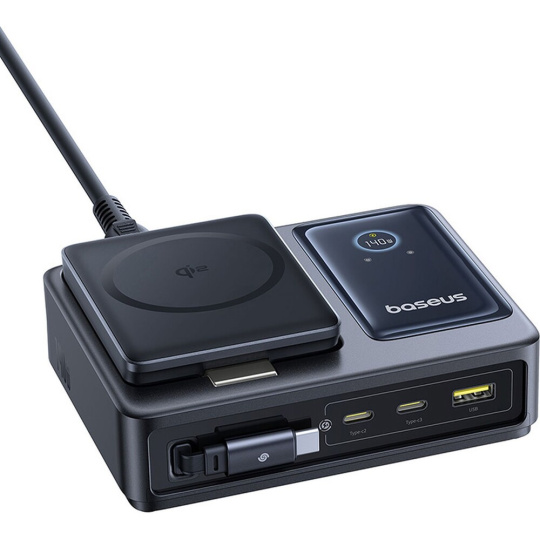 Baseus Nomos Qi2 nabíjecí stanice 140W 3xUSB-C, USB-A s výsuvným kabelem USB-C/síťový kabel 1m černá