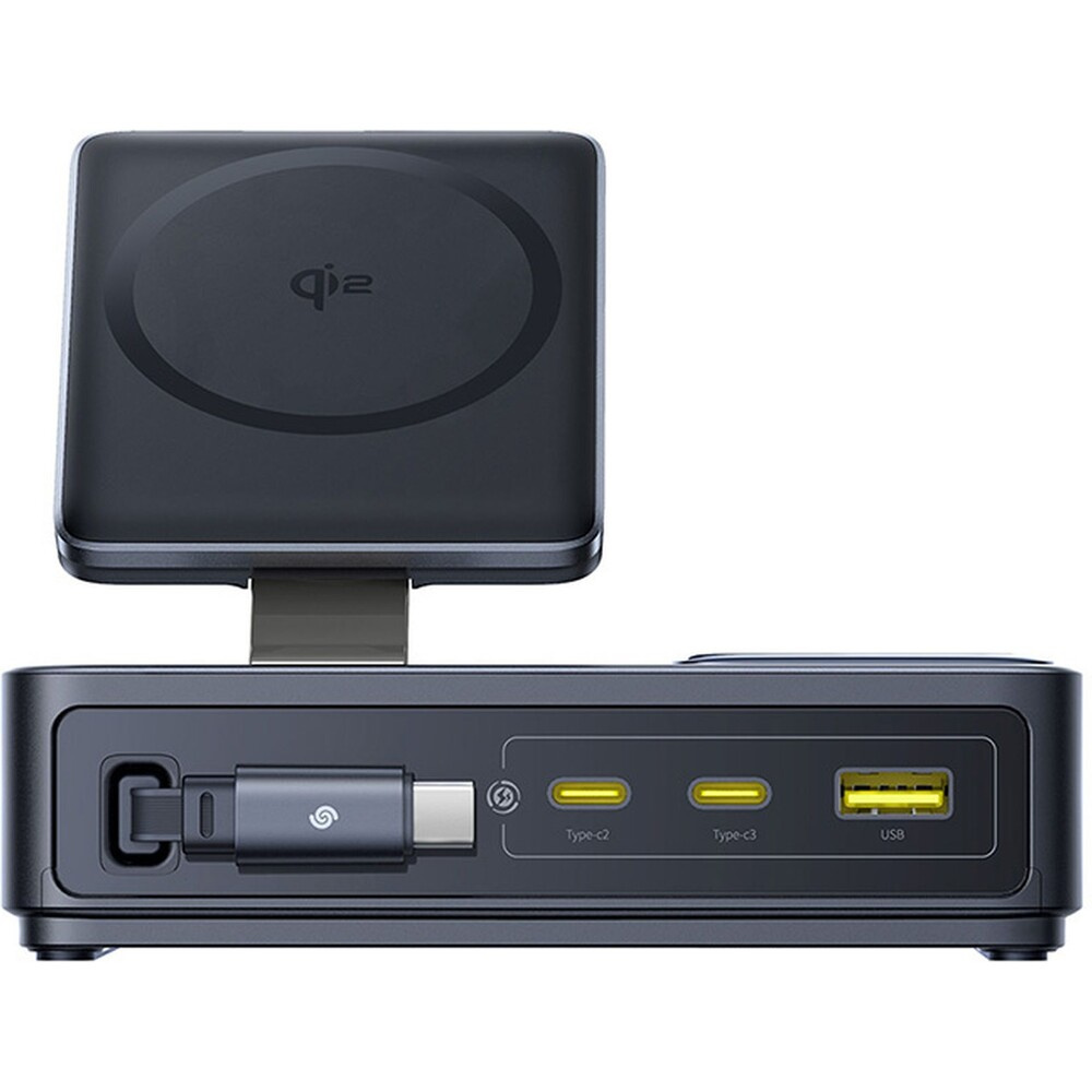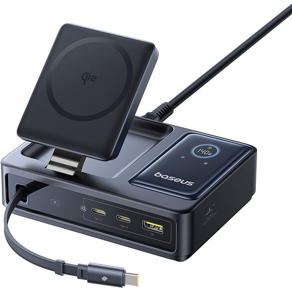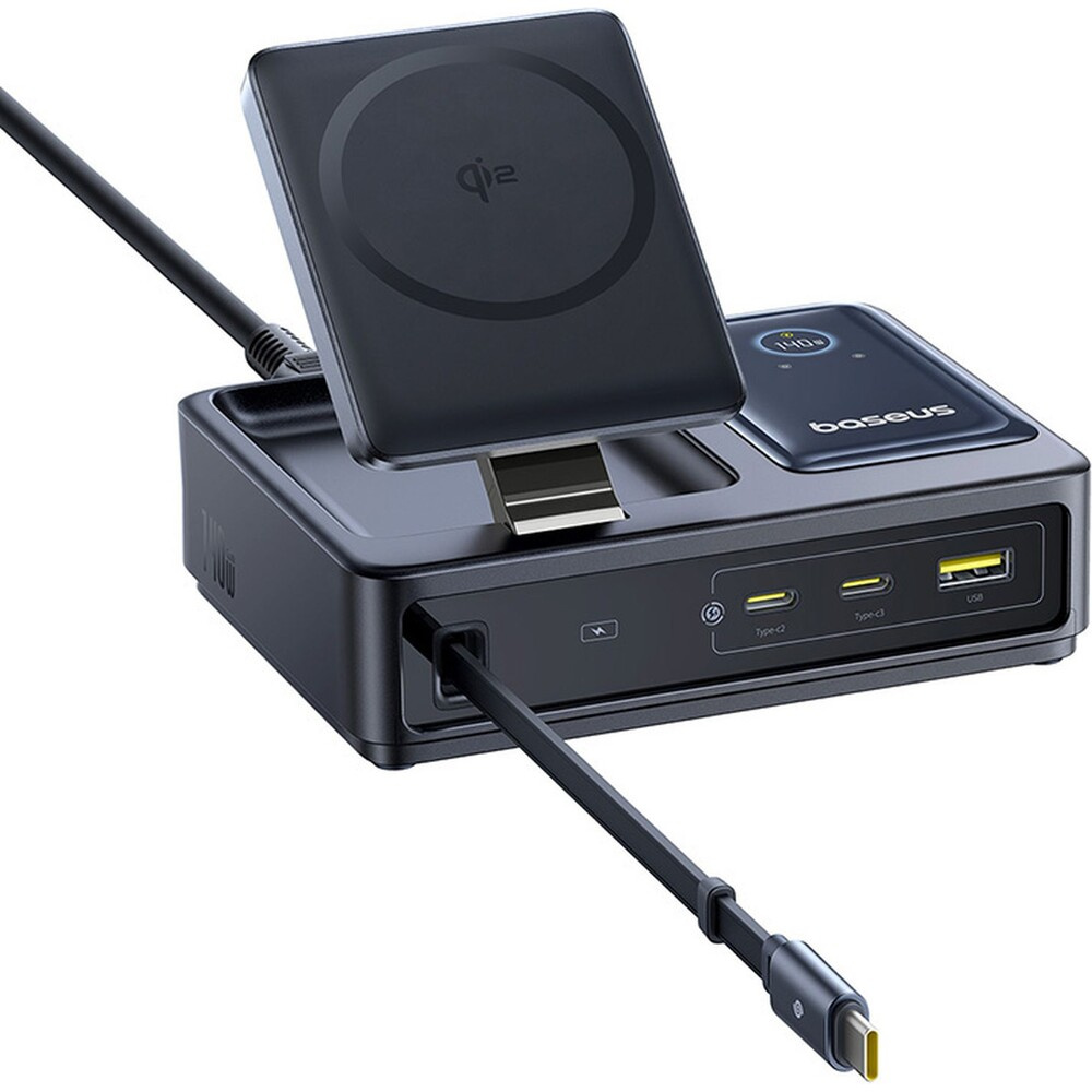 Baseus Nomos Qi2 nabíjecí stanice 140W 3xUSB-C, USB-A s výsuvným kabelem USB-C/síťový kabel 1m černá