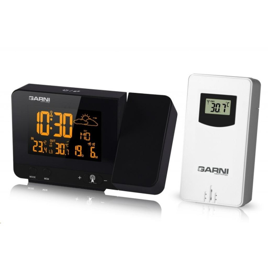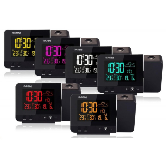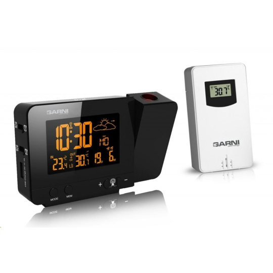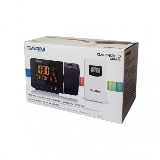 Meteorologická stanice se špičkovým inverzním barevným VA displejem s časem řízeným rádiovým signálem DCF-77, budíkem, měřením vnitřní teploty, bezdrátovým čidlem pro měření vnější teploty a projekcí času a vnitřní / venkovní teploty inverzní barevný VA displej o rozměrech 63 x 42 mm s možností stálého osvětlení při napájení síťovým adaptérem, nebo krátkodobým osvětlením na 15 s při napájení bateriemi 3 stupně jasu osvětlení displeje, možnost vypnutí osvětlení displeje s možností krátkodobého osvětlení na 15 s (při napájení síťovým adaptérem) lze nastavit až 70 barev displeje, nebo režim automatického plynulého střídání barev možnost rychlé volby 8 barev osvětlení displeje velikost číslic na displeji – čas 22 mm, datum, vnitřní a vnější teplota 10 mm, zkratka názvu dne 7 mm čas a datum řízené signálem DCF-77 s možností manuálního nastavení ikona příjmu signálu DCF-77 zkratka názvu dne 12ti, nebo 24 hodinový formát zobrazení času možnost nastavení časového pásma od -1 do +2 hodin budík s 2 budícími časy s funkcí opakovaného buzení (Snooze) po 5 minutách budící signál - 20 sekund 1 pípnutí za sekundu, 20 sekund 2 pípnutí za sekundu, 20 sekund 4 pípnutí za sekundu a poté stálé pípání střídavá projekce času a vnitřní a vnější teploty (teploty se střídají co 5 s) s možností otočení obrazu o 180°, možnost sklopení tubusu projektoru o 90° dopředu a dozadu barva projekce červená stálá projekce při napájení síťovým adaptérem s možností vypnutí 6 animovaných ikon předpovědi počasí (slunečno, polojasno, oblačno, srážky, silný déšť a sněžení) na základě sledování barometrického tlaku vestavěným barometrickým čidlem možnost nastavení výchozí ikony předpovědi počasí zobrazení hodnot vnitřní a vnější teploty paměť na maximální a minimální naměřené hodnoty teploty s automatickým mazáním v 0:00 hodin šipky tendence vývoje barometrického tlaku, vnitřní a vnější teploty indikace námrazy vnější teploty v rozsahu od -1°C do +3°C ikonou na displeji zobrazení teploty ve °C, nebo °F možnost použití až 3 bezdrátových čidel GARNI 029 (jedno čidlo GARNI 029 je součástí dodávky) bezdrátový přenos hodnot vnější teploty na frekvenci 433 MHz ikona příjmu signálu bezdrátového čidla USB port pro nabíjení mobilních zařízení (pouze při napájení hlavní jednotky síťovým adaptérem), maximální nabíjecí proud 1 000 mA ikony slabých baterií napájení síťovým adaptérem, nebo bateriemi možnost postavení barva černá Bezdrátové čidlo GARNI 029 vlhkosti odolné displej o rozměrech xxxxxx mm velikost číslic na displeji: teplota xxxxxx mm měření teploty 3 kanály maximální RF výkon 10 dBm (10 mW) možnost postavení a zavěšení barva bílá Obsah balení: 1 x hlavní jednotka GARNI 365 Arcus 1 x bezdrátové čidlo GARNI 029 1 x síťový adaptér český, slovenský, německý, anglický, italský, polský a maďarský návod.