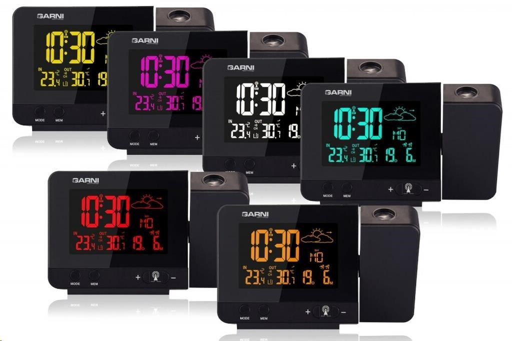 Meteorologická stanice se špičkovým inverzním barevným VA displejem s časem řízeným rádiovým signálem DCF-77, budíkem, měřením vnitřní teploty, bezdrátovým čidlem pro měření vnější teploty a projekcí času a vnitřní / venkovní teploty inverzní barevný VA displej o rozměrech 63 x 42 mm s možností stálého osvětlení při napájení síťovým adaptérem, nebo krátkodobým osvětlením na 15 s při napájení bateriemi 3 stupně jasu osvětlení displeje, možnost vypnutí osvětlení displeje s možností krátkodobého osvětlení na 15 s (při napájení síťovým adaptérem) lze nastavit až 70 barev displeje, nebo režim automatického plynulého střídání barev možnost rychlé volby 8 barev osvětlení displeje velikost číslic na displeji – čas 22 mm, datum, vnitřní a vnější teplota 10 mm, zkratka názvu dne 7 mm čas a datum řízené signálem DCF-77 s možností manuálního nastavení ikona příjmu signálu DCF-77 zkratka názvu dne 12ti, nebo 24 hodinový formát zobrazení času možnost nastavení časového pásma od -1 do +2 hodin budík s 2 budícími časy s funkcí opakovaného buzení (Snooze) po 5 minutách budící signál - 20 sekund 1 pípnutí za sekundu, 20 sekund 2 pípnutí za sekundu, 20 sekund 4 pípnutí za sekundu a poté stálé pípání střídavá projekce času a vnitřní a vnější teploty (teploty se střídají co 5 s) s možností otočení obrazu o 180°, možnost sklopení tubusu projektoru o 90° dopředu a dozadu barva projekce červená stálá projekce při napájení síťovým adaptérem s možností vypnutí 6 animovaných ikon předpovědi počasí (slunečno, polojasno, oblačno, srážky, silný déšť a sněžení) na základě sledování barometrického tlaku vestavěným barometrickým čidlem možnost nastavení výchozí ikony předpovědi počasí zobrazení hodnot vnitřní a vnější teploty paměť na maximální a minimální naměřené hodnoty teploty s automatickým mazáním v 0:00 hodin šipky tendence vývoje barometrického tlaku, vnitřní a vnější teploty indikace námrazy vnější teploty v rozsahu od -1°C do +3°C ikonou na displeji zobrazení teploty ve °C, nebo °F možnost použití až 3 bezdrátových čidel GARNI 029 (jedno čidlo GARNI 029 je součástí dodávky) bezdrátový přenos hodnot vnější teploty na frekvenci 433 MHz ikona příjmu signálu bezdrátového čidla USB port pro nabíjení mobilních zařízení (pouze při napájení hlavní jednotky síťovým adaptérem), maximální nabíjecí proud 1 000 mA ikony slabých baterií napájení síťovým adaptérem, nebo bateriemi možnost postavení barva černá Bezdrátové čidlo GARNI 029 vlhkosti odolné displej o rozměrech xxxxxx mm velikost číslic na displeji: teplota xxxxxx mm měření teploty 3 kanály maximální RF výkon 10 dBm (10 mW) možnost postavení a zavěšení barva bílá Obsah balení: 1 x hlavní jednotka GARNI 365 Arcus 1 x bezdrátové čidlo GARNI 029 1 x síťový adaptér český, slovenský, německý, anglický, italský, polský a maďarský návod.