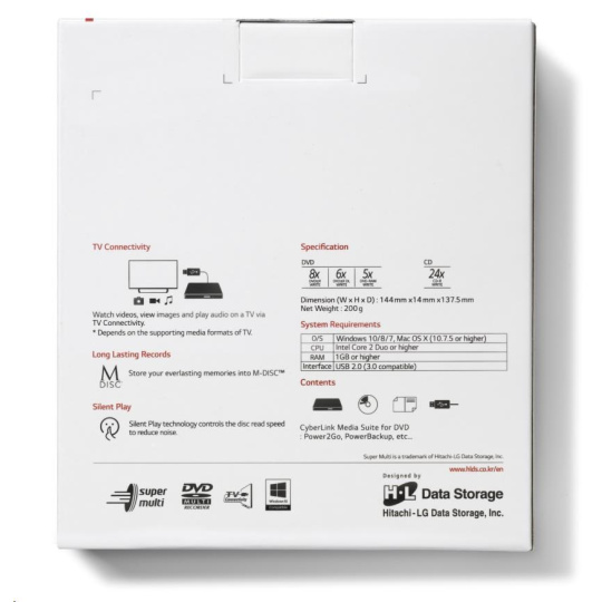BAZAR - HITACHI LG - externí mechanika DVD-W/CD-RW/DVD±R/±RW/RAM GP60NW60, Slim, White, box+SW - Poškozený obal (Komplet