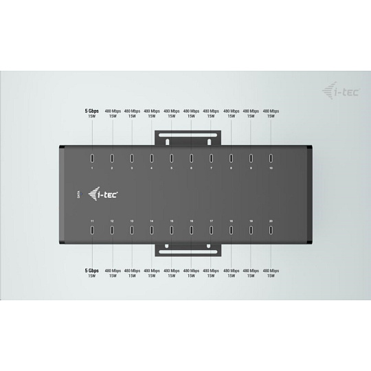Tento moderní HUB nabízí 20 USB-C s funkcí Plug & Play a nabíjením až 15W na port. Díky tomu, že HUB má 20 USB portů, je možno nabíjet až 20 zařízení najednou.