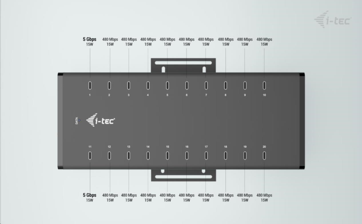 Tento moderní HUB nabízí 20 USB-C s funkcí Plug & Play a nabíjením až 15W na port. Díky tomu, že HUB má 20 USB portů, je možno nabíjet až 20 zařízení najednou.