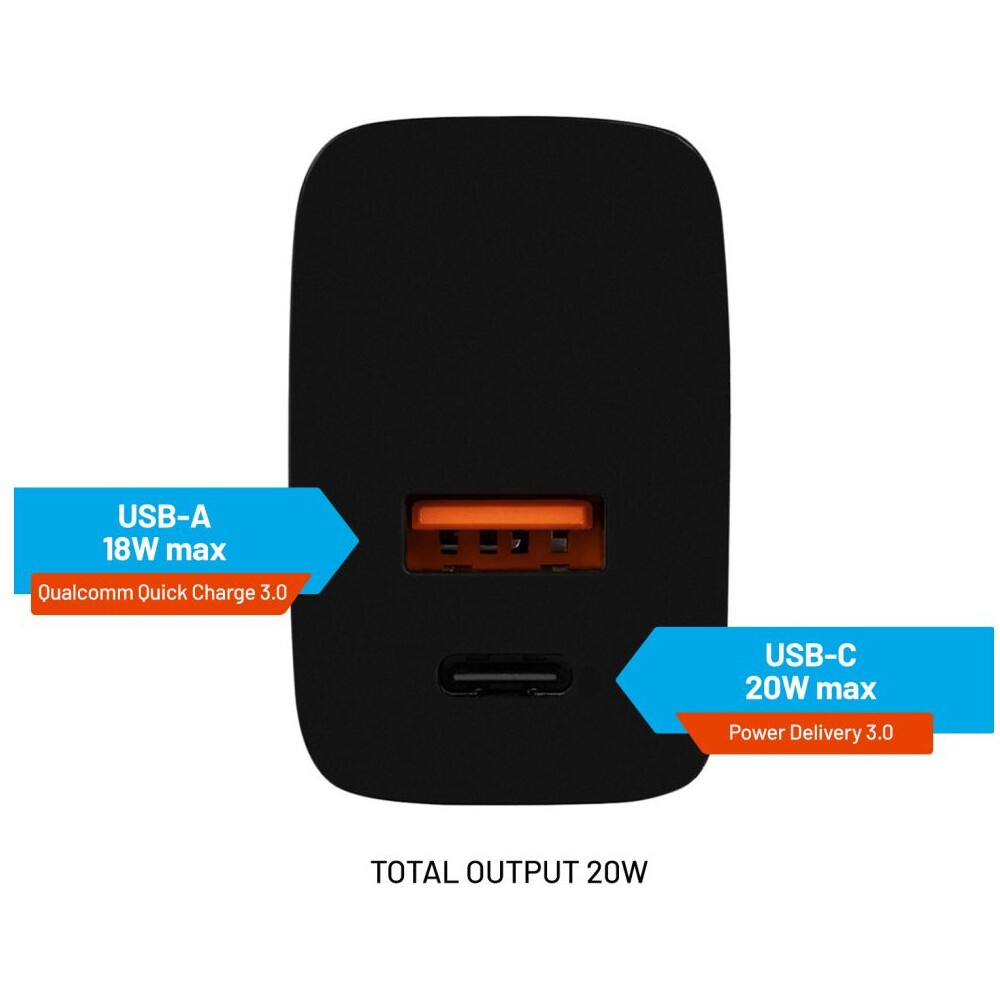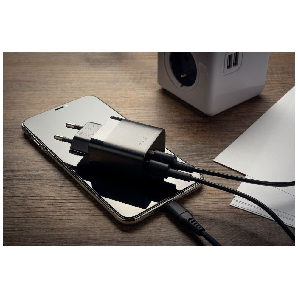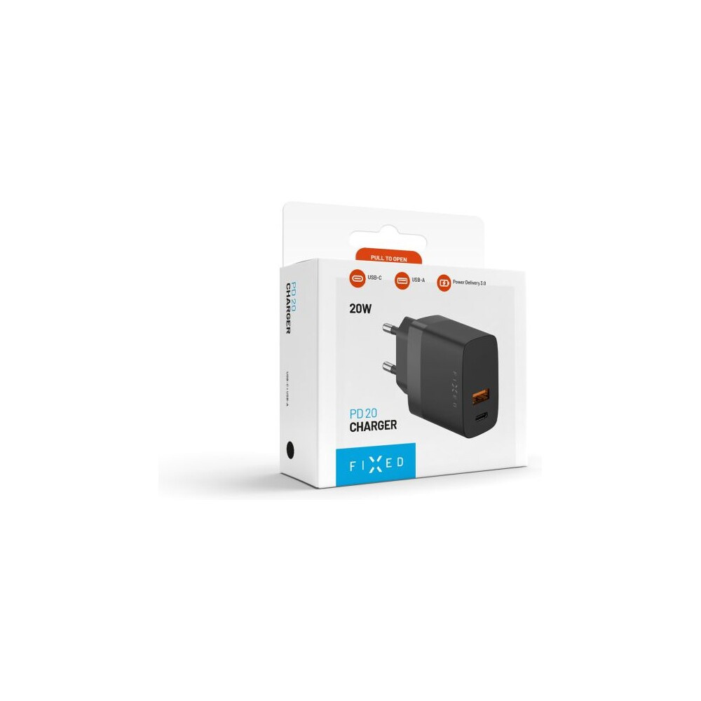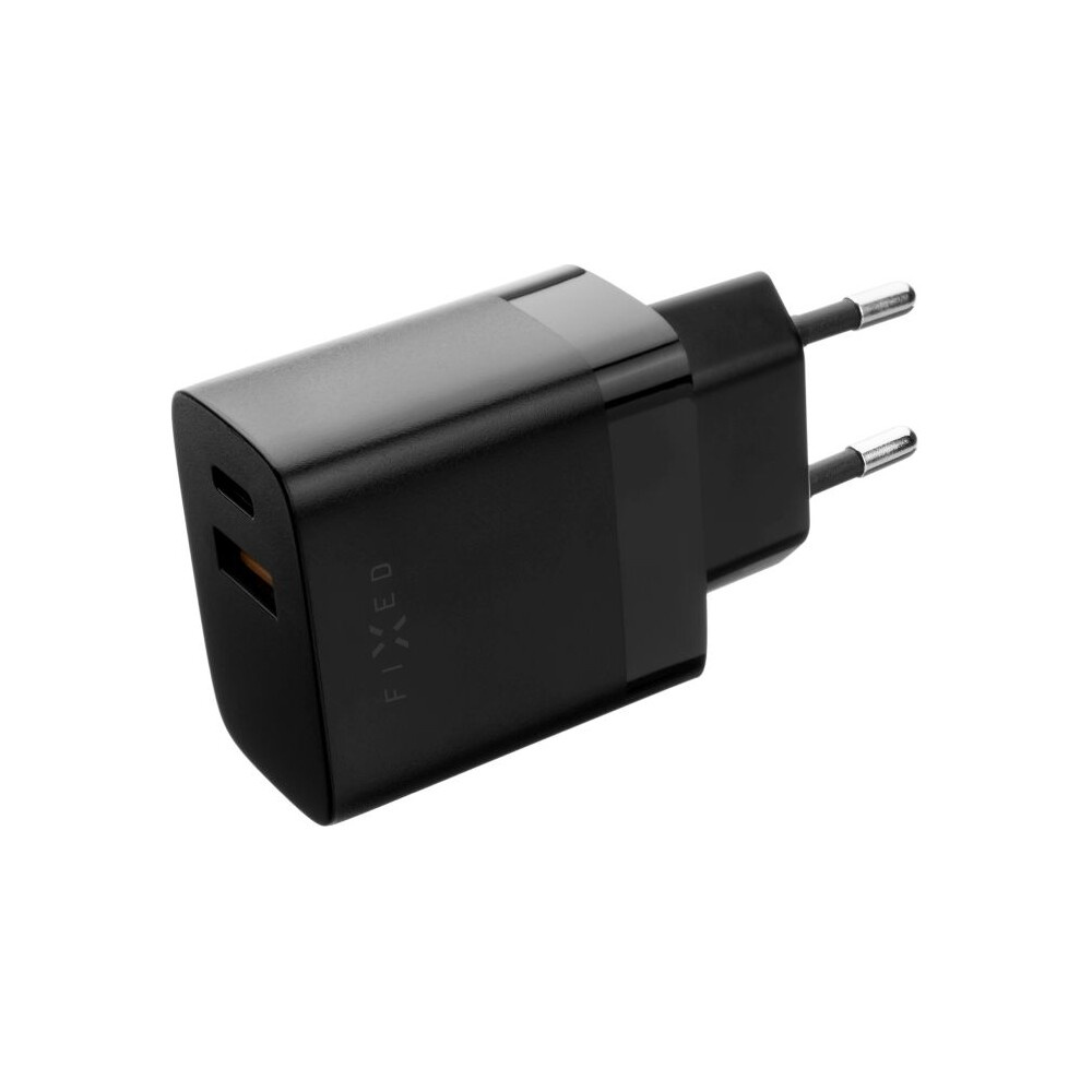 FIXED síťová nabíječka s USB-C a USB výstupem, podpora PD a QC 3.0, 20W, černá