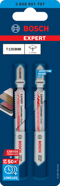Vydrží až 50× déle v odolných materiálech než pilový plátek Bosch T101B - Při montáži laminátových podlah nebo obkladů HPL musí být řezy přímočarou pilou čisté. Materiál je ale tak abrazivní, že se běžné plátky rychle otupí a přestanou fungovat. Pilový plátek EXPERT Laminate Clean T128BHM kombinuje čisté řezání protisměrně orientovaných zubů s technologií Carbide Technology, aby se zachoval skvělý výkon po celou dobu velmi dlouhé životnosti. Jeho karbidové ozubení zajišťuje opakované, vysoce kvalitní řezy do abrazivních materiálů, jako jsou vlákny vyztužené vinylové podlahy a panely z vysokotlakého laminátu. Velmi jemné zuby řežou v tenkém materiálu hladce a protisměrný design zajišťuje velkou čistotu řezu na obou jeho stranách. Bosch EXPERT Laminate Clean T128BHM je vysoce výkonným pilovým plátkem pro přímočaré pily pro práci s laminátem. Vzhledem k velmi dlouhé životnosti je také jasnou volbou pro řemeslníky, které už nebaví plýtvat penězi za pilové plátky, které nevydrží. Kompatibilní se všemi pilami s upínáním do T.