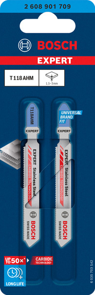Vydrží až 50× déle v odolných materiálech než pilový plátek Bosch T118G - Řezání plechů z nerezové oceli je každodenním úkolem pro kovodělníky. Je běžné i při montáži kuchyní a stavbě průmyslových či kancelářských budov. Profesionálové, kteří se této práci věnují, potřebují spolehlivý plátek, který se nepoškozuje. Jen tak se lze vyhnout frustraci z neustálé výměny plátků. Pilový plátek EXPERT Stainless Steel je optimalizován pro nejtvrdší kovy a má rozteč zubů odpovídající tloušťce plechů, které zpracováváte. Extrémní odolnost tohoto plátku zaručuje karbidové technologie Bosch Carbide Technology – ozubení z nejtvrdšího kovu je k tělu přivařeno laserem. Řeže nejodolnější plechy extrémně efektivně a nabízí tu nejlepší životnost. Pilový plátek Bosch EXPERT Stainless Steel na tenké materiály se dodává ve dvou verzích: Pilový plátek T118 AHM pro řezy do tenkého plechu má velmi jemnou rozteč zubů. Verze T118 EHM se střední roztečí ozubení je pak nejlepší volbou pro řemeslníky, kteří chtějí řezat středně silné plechy z nerezové oceli té nejvyšší pevnosti nebo a tenkostěnné trubky. Kompatibilní se všemi pilami s upínáním do T.
